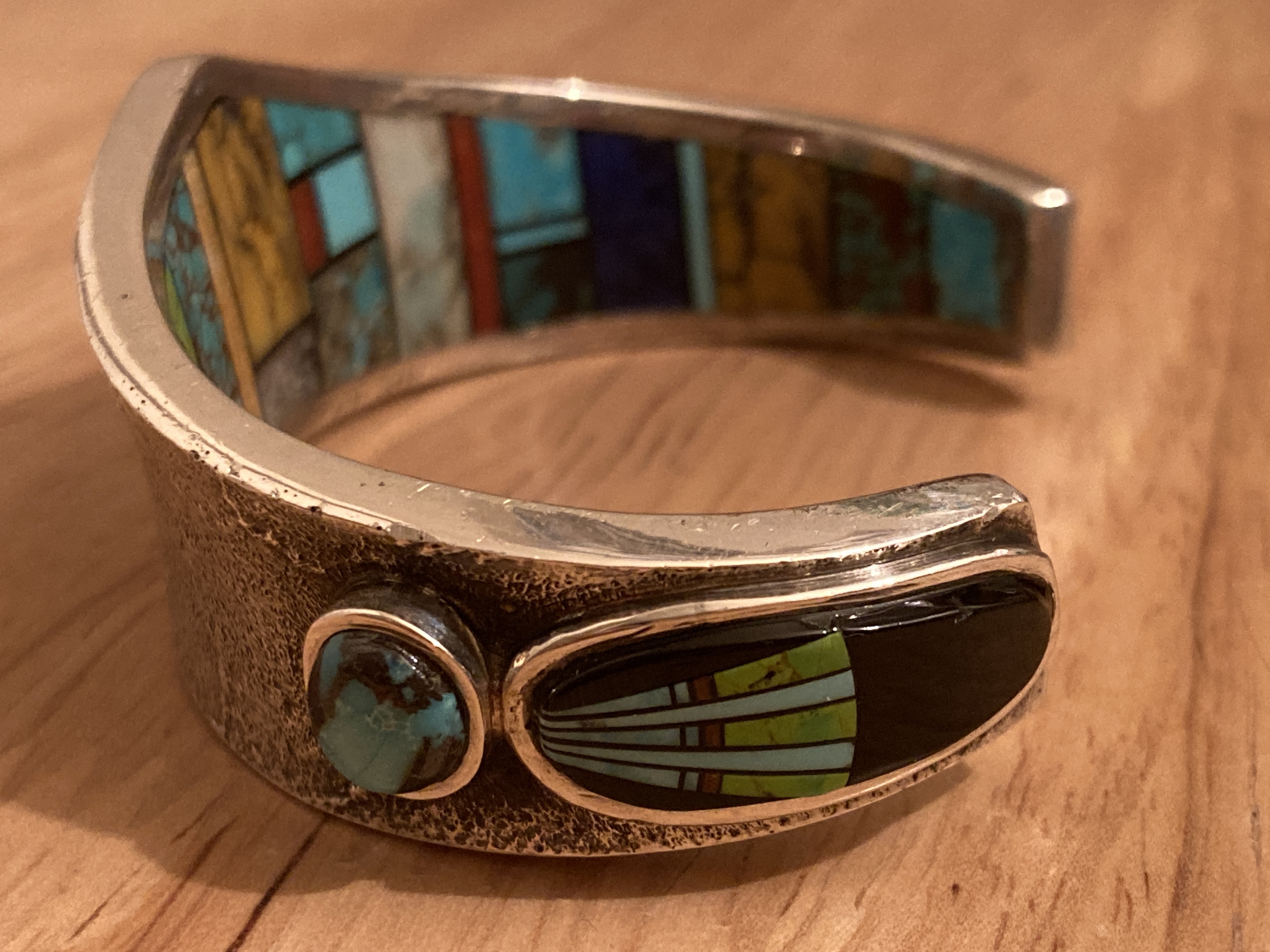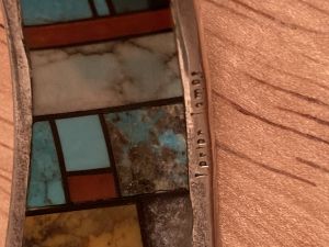 ホピ族のオーバーレイとは少し感じが異なると思います。通常ホピオーバーレイは陶器やバスケットの模様をモチーフにしますが、こちらはそうではなく単純にホピ風の幾何学模様で埋めているようです。