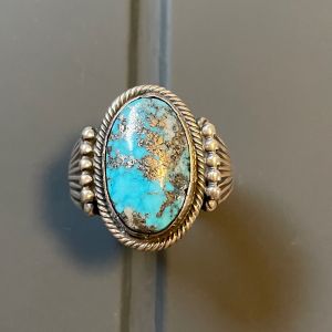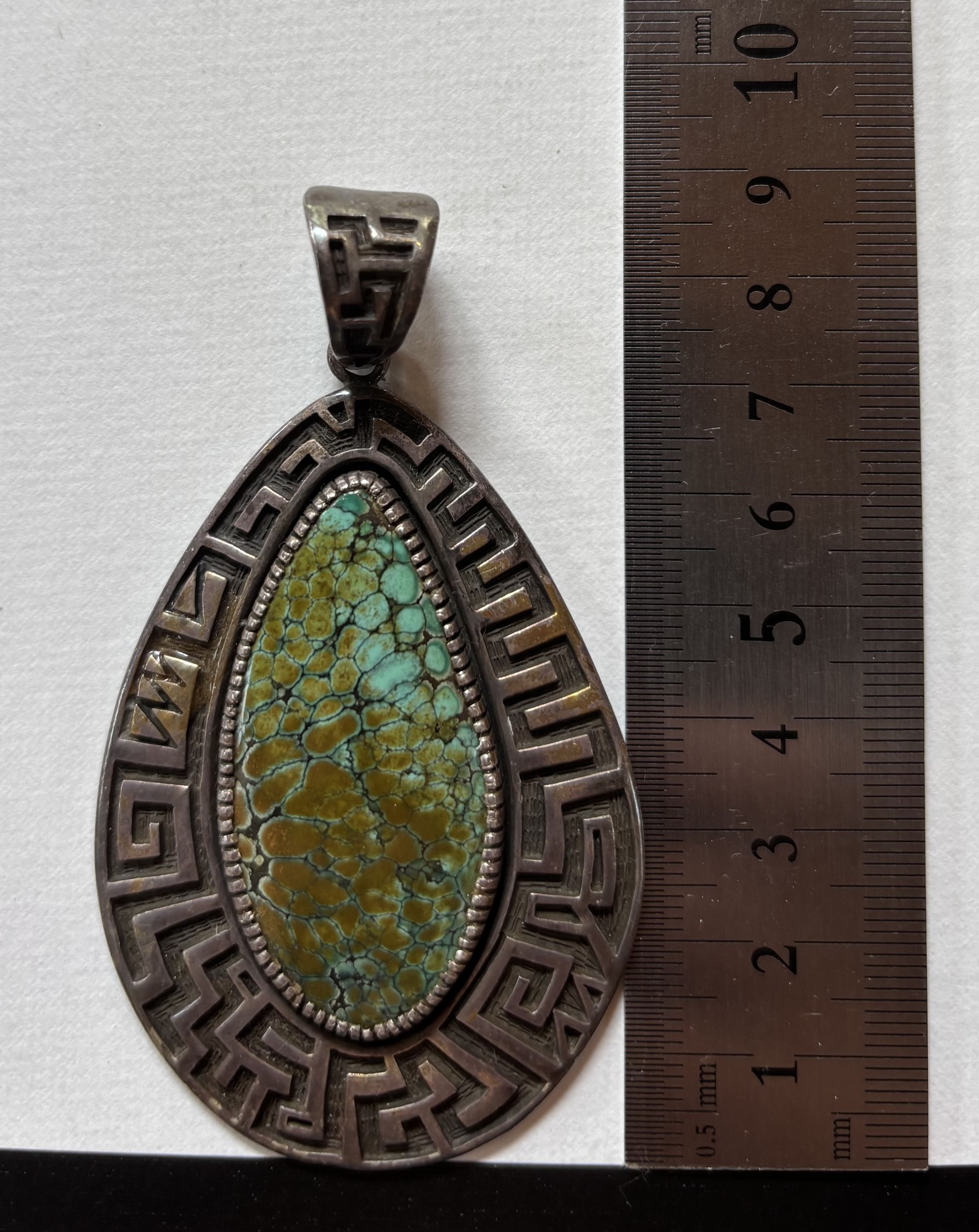 サイズは70mm✖️50mm、重さは51gで大ぶりのターコイズの周りのスタンプワークに一目惚れして何十年か前に東急東横で出店されていたところで購入したものです(うろ覚えですが